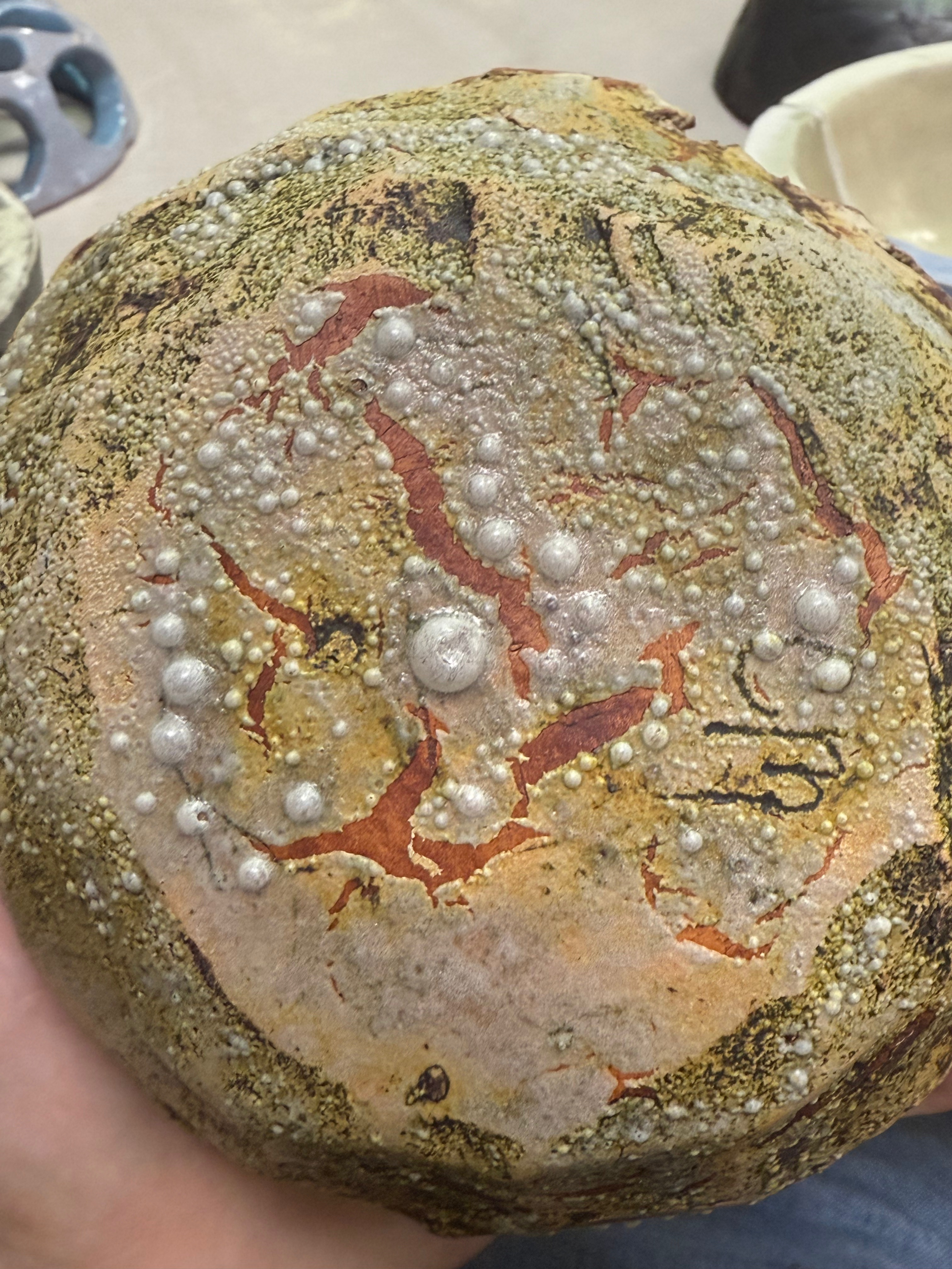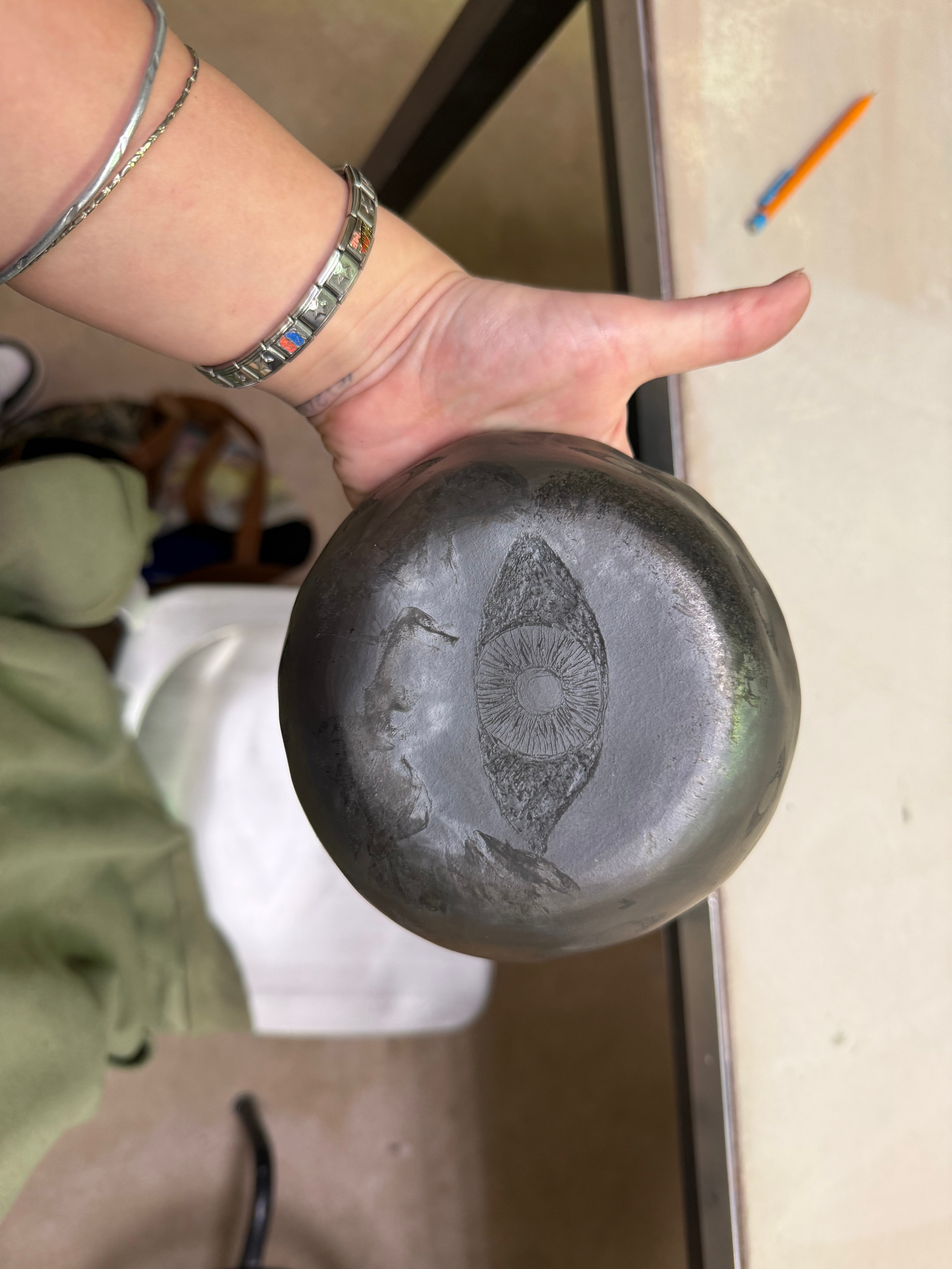We did nine techniques in total. The first form is a burnished surface bowl. In order to create the glassy, dark, effect I rubbed a metal spoon against the clay for a long time to compress it. Then, I carved in a design. The second form was a sgraffito bowl. To make this form we covered our forms in two layers of colored slip, which is watered down clay with colors added into it, and after it dried we carved out a pattern. The third form was a color wheel with different colored slips in the studio so we could test out using them and see what they look like after being fired. The fourth form was a cut out design and the fifth form was an imprinted texture design. Both the fourth and fifth bowl had to have a repeating design with the fourth focusing on negative space and the fifth focusing on movement.